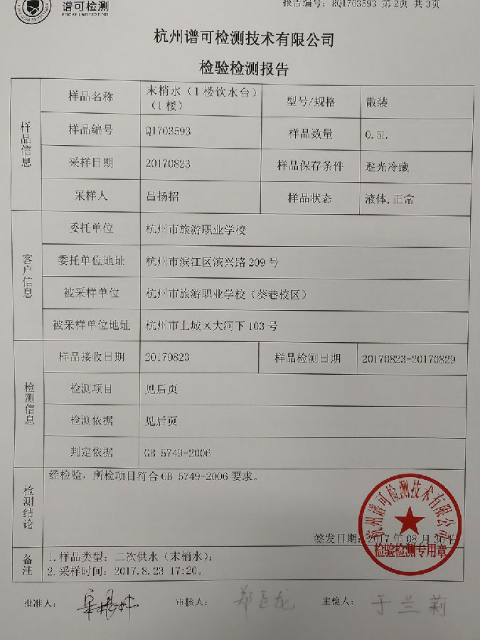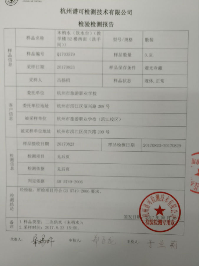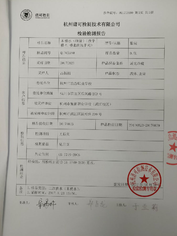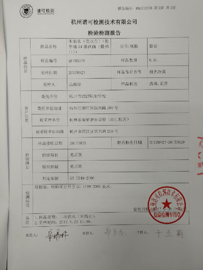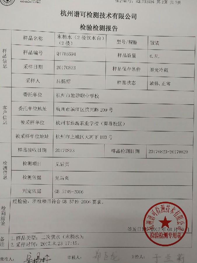 直饮水的工程维护和检测是学校饮食放心工程的重要抓手,现学校按照三个月一次的饮水机换芯和检测规律,经开学再次检测指标水质符合要求,请全体师生放心饮用。现将检测图片提供如下: