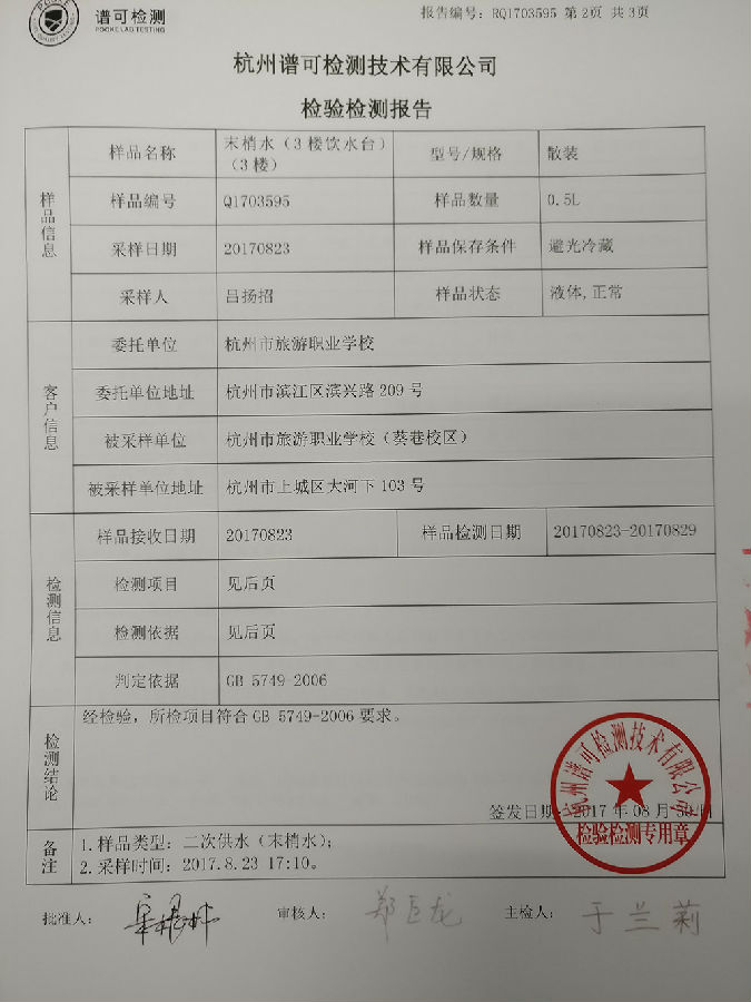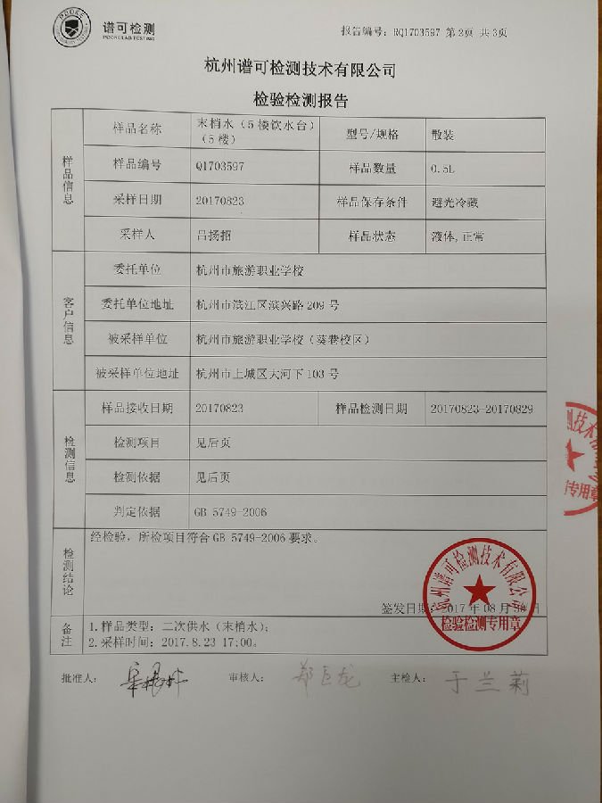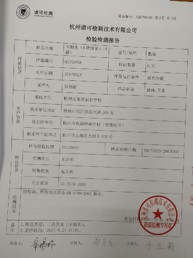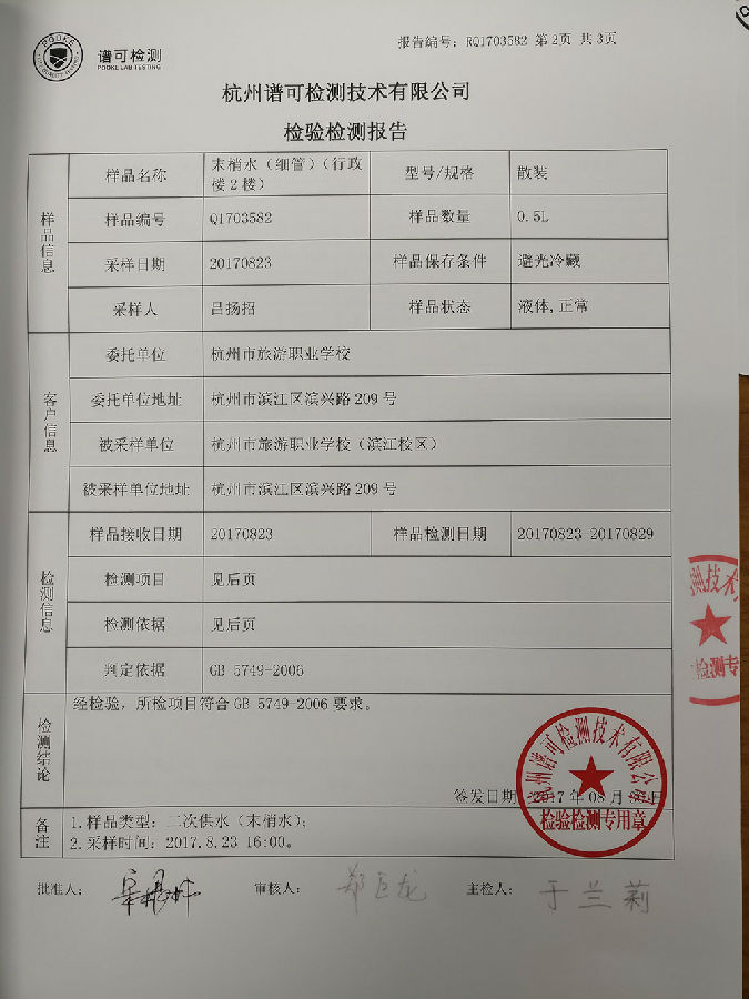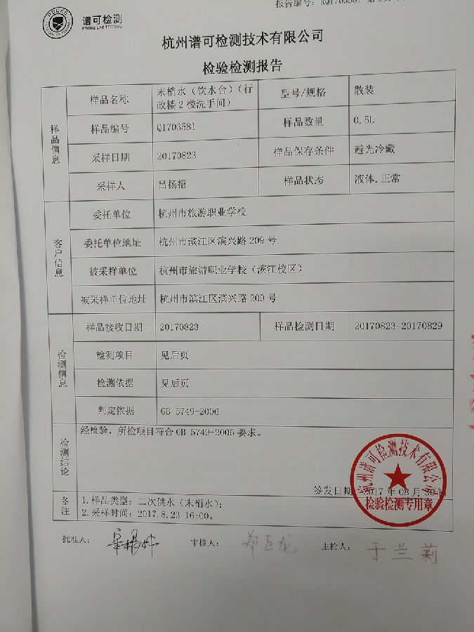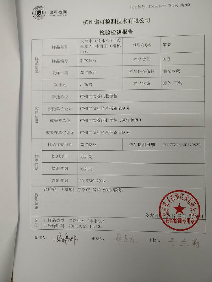 直饮水的工程维护和检测是学校饮食放心工程的重要抓手,现学校按照三个月一次的饮水机换芯和检测规律,经开学再次检测指标水质符合要求,请全体师生放心饮用。现将检测图片提供如下: